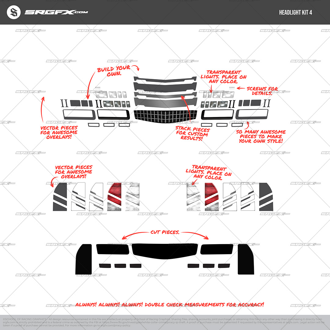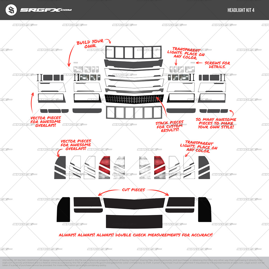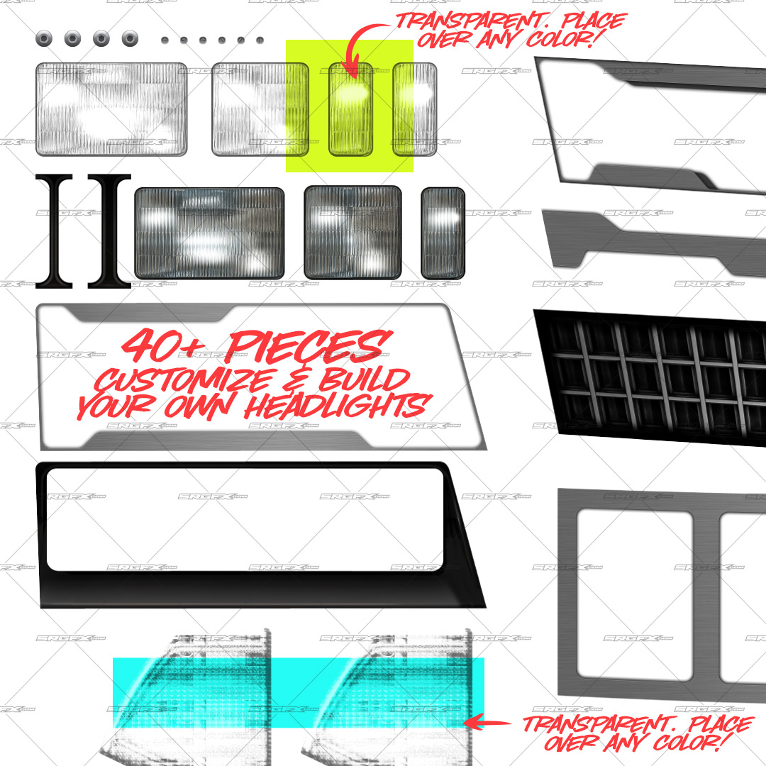 Headlight Kit 4 is a professionally built, Monte Carlo–likeness headlight and front-end graphic package created specifically for race wrap designers and print shops. The kit includes layered, high-resolution headlight, taillight, grille, and trim components that can be customized, recolored, stacked, and integrated directly into your existing wrap designs.