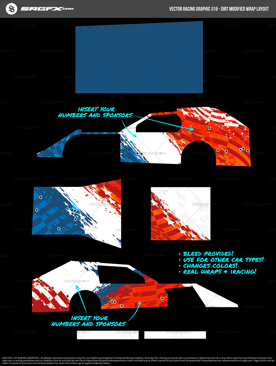 Originally launched in 2014, Stars and Stripes Graphic 018 returns with a high-impact update featuring refined elements, smoother gradients, enhanced layering and cleaner paths. Now also inludes a full Dirt Modified Wrap Layout. These updates are FREE in your account center if you already purchased. This digital racing graphic explodes with patriotic energy—perfect for wraps, liveries, iracing or merch that need that all-American punch.