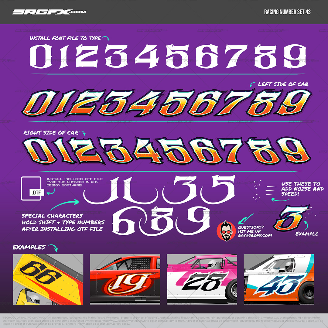Black Letter Racing Number Set 43 features an aggressive aesthetic that ensures your next wrap design demands attention with attitude. The crisp edges and rounded shapes enhance attitude at high speeds, giving the design noticeably and a readable edge. Simple to customize and apply, these numbers provide a professional look for race wraps at all levels.