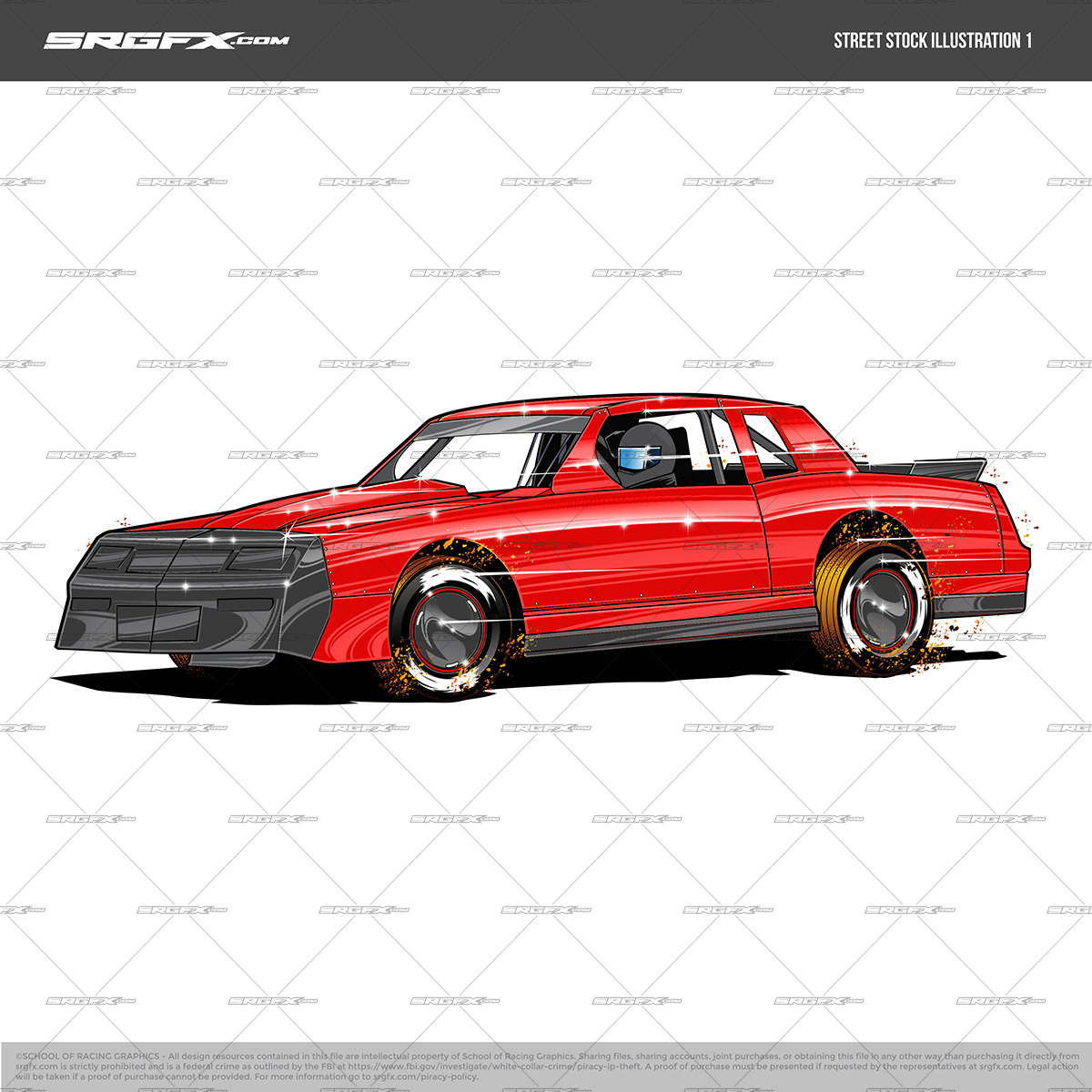 Dirt Street Stock Illustration 1 is a left side 3/4 view of a hard charging Dirt Street Stock in action. Customize, recolor and place this illustration within any design to suit your project needs. Body style reminiscent of a Chevy Monte Carlo or a Buick grand national. Perfect for T-shirts, hats, hero cards, signs, decals, template layouts and more!
