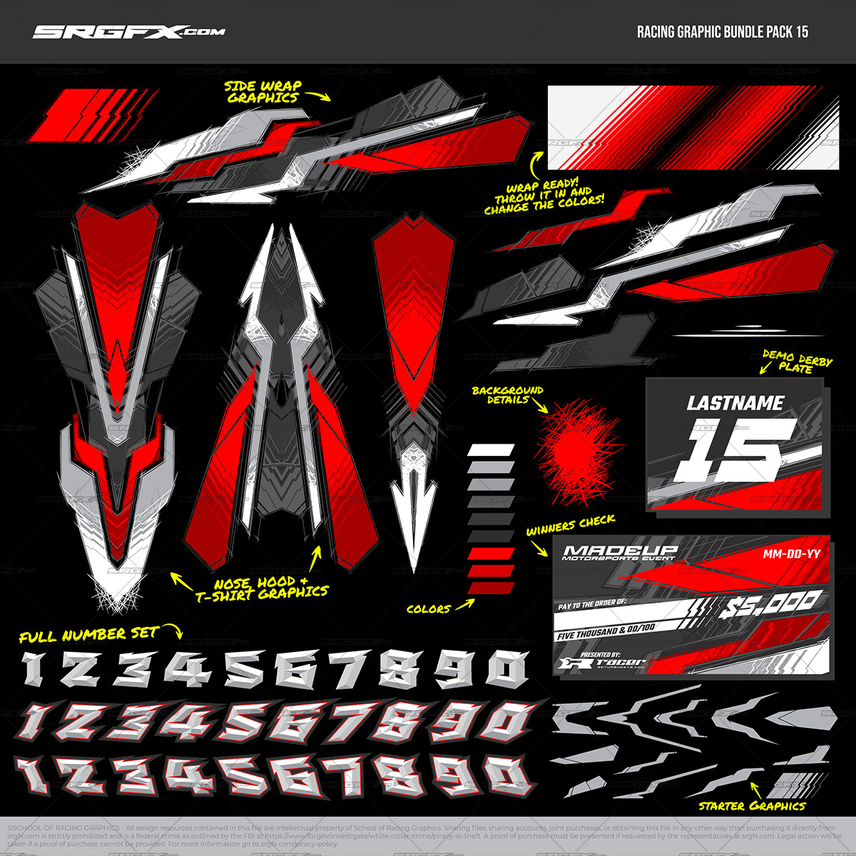 Included are base graphics for a hatched, hand drawn, scribbled wrap theme. Modify and create new base graphics easily. There is so much cool stuff in this pack, and so many awesome things you will create when customizing it for your own unique look. Stack the graphics for more details or remove elements for a clean look. Also included is a sponsor template, and a full number set. Install the 3 fonts included in the download and simply retype the text to match your project sponsorship needs. Need graphics for a full coverage wrap design? We have you covered!