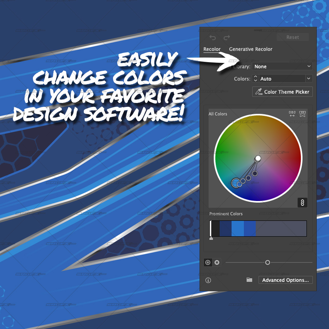 A. The colors on any SRGFX.com racing graphics can be easily changed. You must have a vector graphic editing program to do so. The reason SRGFX.com sometimes provides color variations is for quick, out of the box options. The following programs can be used to change and manipulate our vector racing graphic packs.Adobe Illustrator, Corel Draw, Flexi Sign, Inkscape (Free Program), SignLab, SignBlazer, Vinyl Express LXi, Vinyl Master, etc.