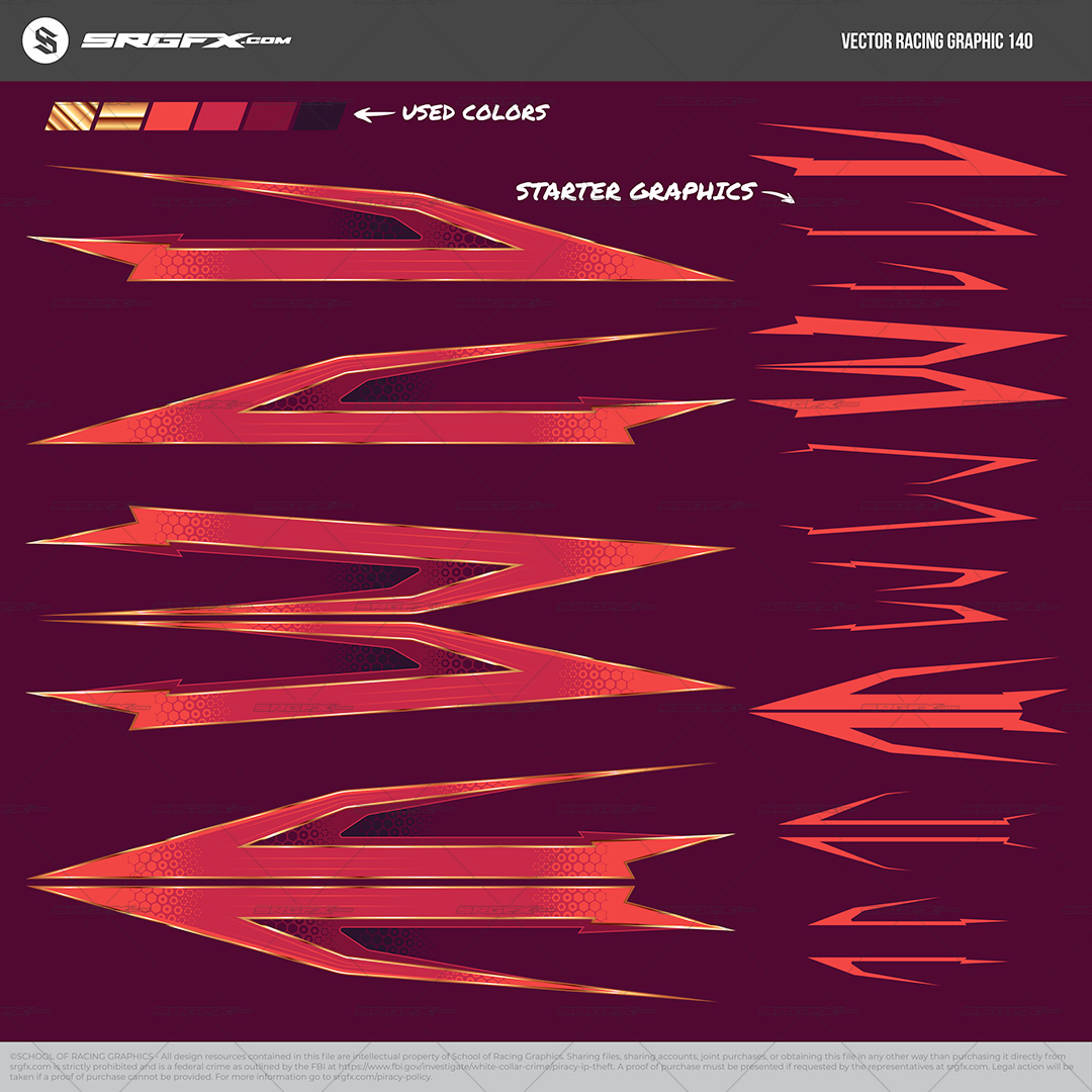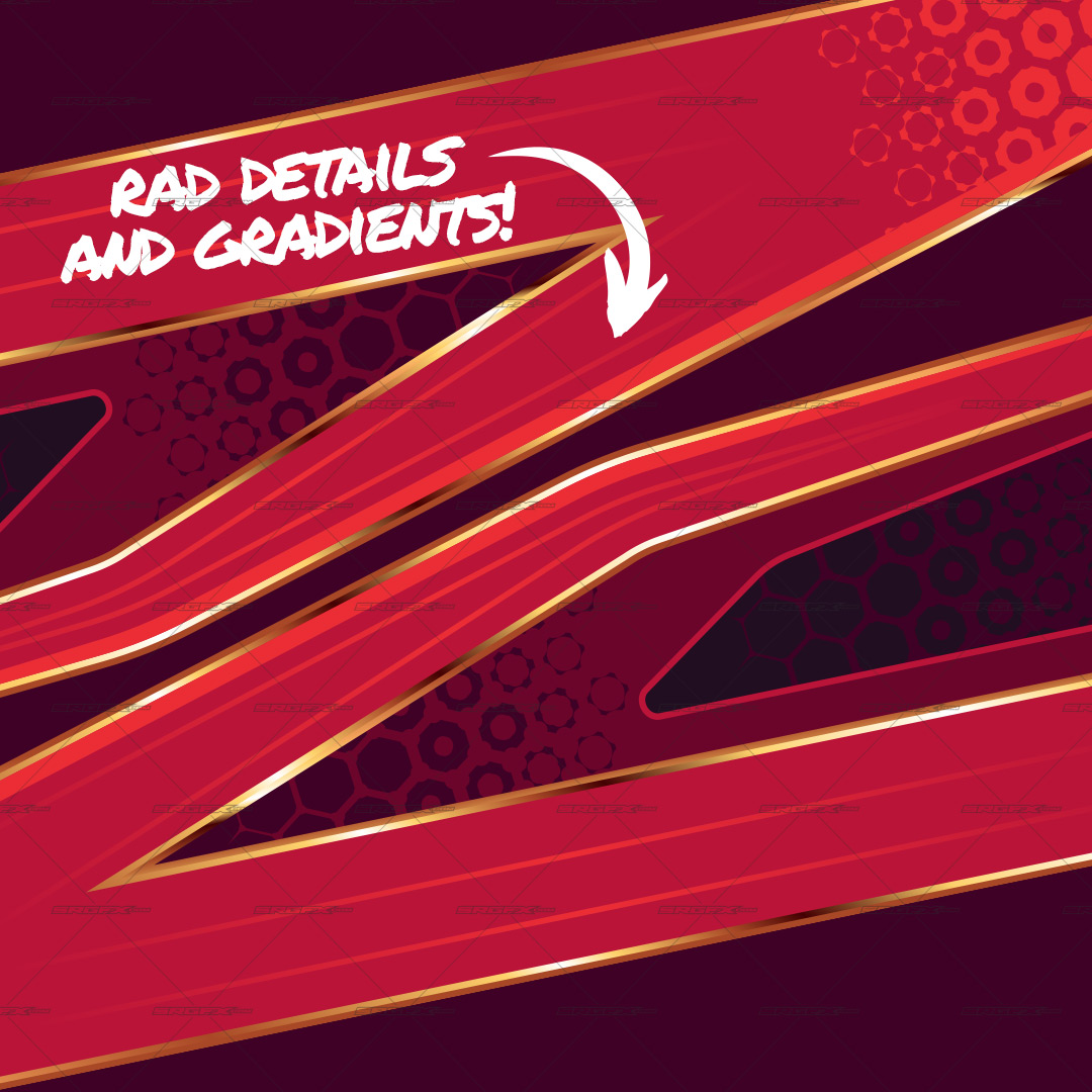 Experience an infusion of style and energy with this bold vector racing graphic from SRGFX.com. Its sleek and straight lines, angular shapes and sharp contours are arranged to convey speed and precision, while the vivid color palette ensures your vehicle or promotional materials stand out in any crowd. Created as a fully scalable vector, the design remains crisp at any size—perfect for race car wraps, team apparel, decals, or large-scale banners. Multiple layers enable quick, precise edits, so you can easily adjust colors, shapes, or overlays to match specific team branding or personal preferences. Whether you’re an industry professional or an enthusiast looking to upgrade your racing aesthetic, this dynamic and polished graphic delivers the impact you need to make a memorable impression on and off the track.