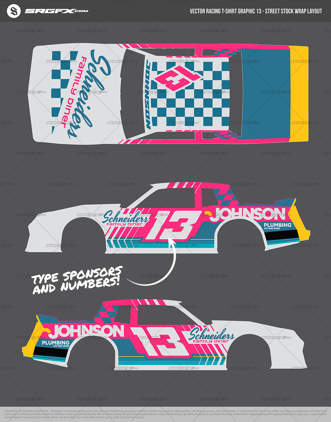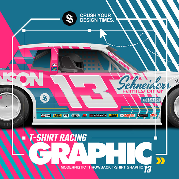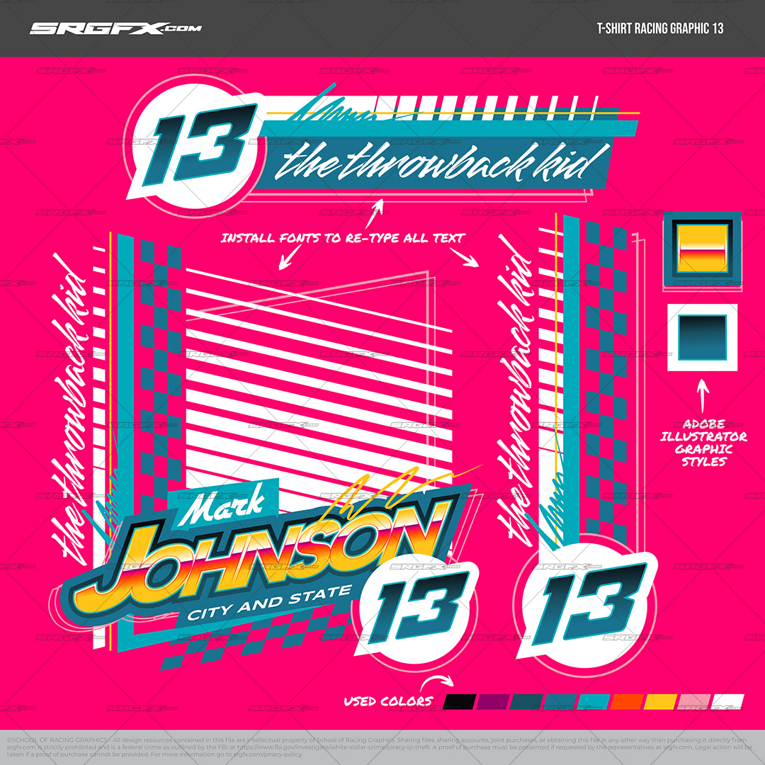 This vector racing design package blends a modern layout structure with an 80s throwback vibe — neon accents, checkers, and layered striping — without locking you into a retro theme. It includes a full street stock wrap layout plus matching T-shirt graphic elements, all fully editable. Fonts are included for retyping sponsors, and the racing number set is typeable (numbers only, no alphabet characters).