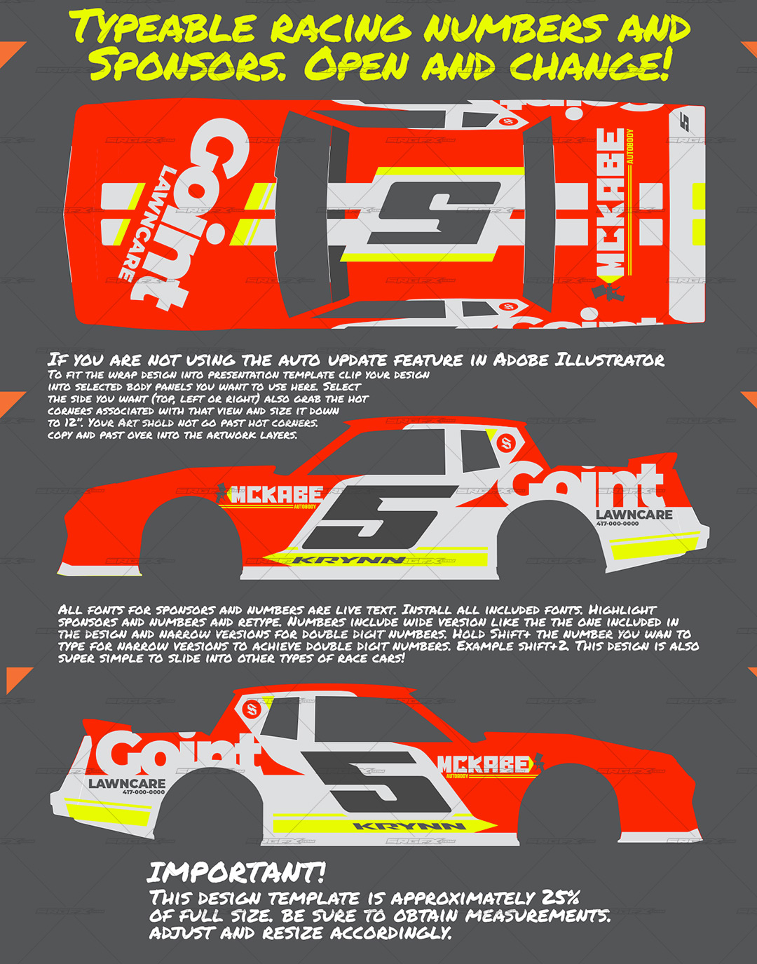 The SRGFX Ultimate Dirt/Asphalt Street Stock Template is the most adjustable and easy to modify template on the Market. The Auto update feature in Adobe Illustrator saves hours of time. Design on your full size (expect to adjust before print) template and the design is auto updated on the presentation template.