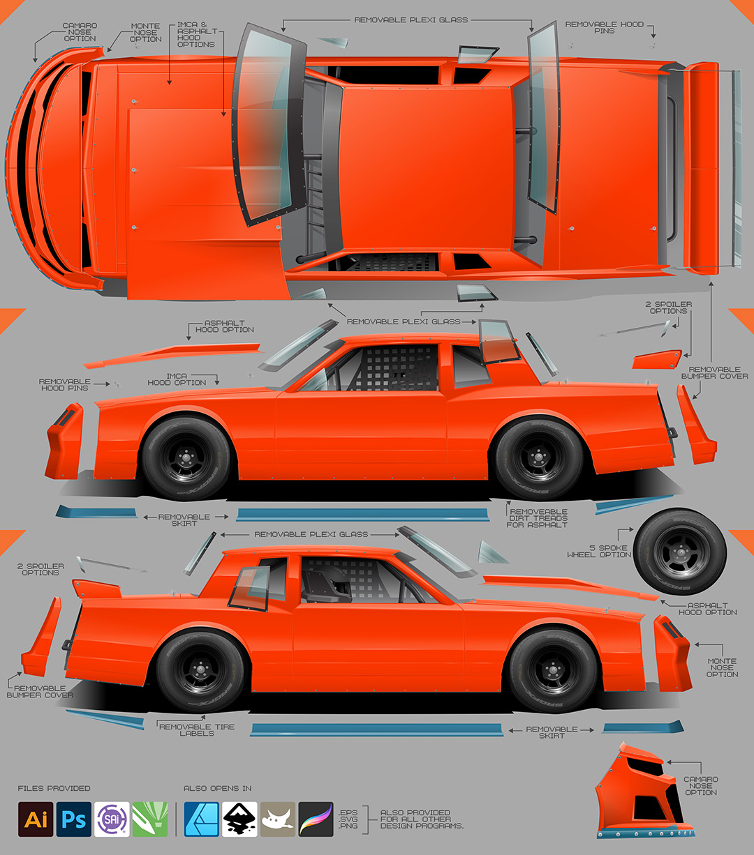 The most customizable Dirt and Asphalt Street Stock Monte Carlo Wrap template on the market. Period.