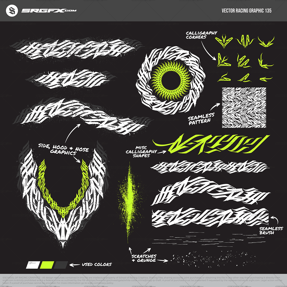 This racing graphic is suitable for all types of vehicles, whether they are used in motorsports or for commercial purposes. With its dynamic Calligraphy lines and shapes, this graphic offers a bold and time-saving solution for your wrap and graphic design projects. Whether you’re a hobbyist working with Slot Cars, RC Cars, or designing skins for video games, or if you’re involved in creating life-size vehicle wraps for race cars, motorsports vehicles, or commercial transport, this graphic is an ideal choice. In summary, this graphic asset streamlines your design process, allowing you to cut your design time in half.